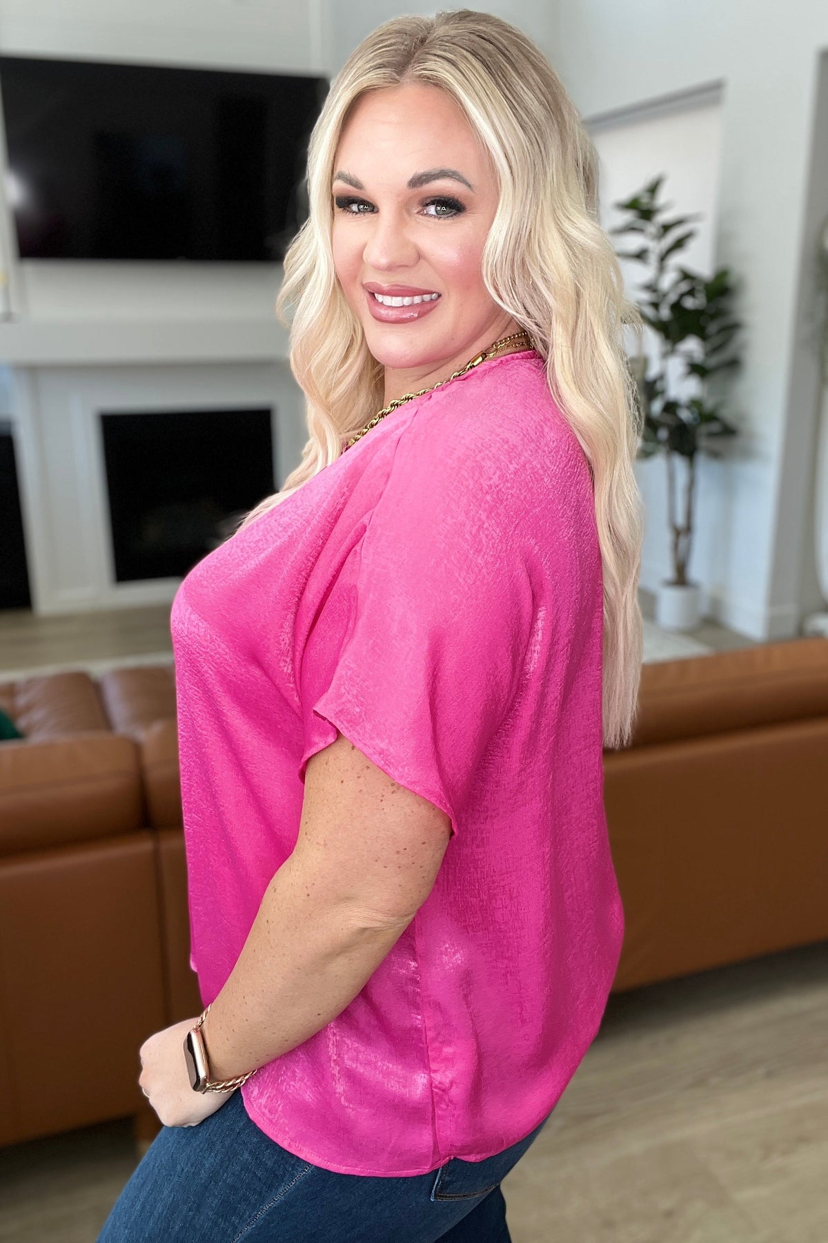 Discover effortless elegance with our Pleat Front V-Neck Top in Hot Pink! Made of luxurious satin, this blouse features a flattering V-neck and drop shoulder design for a comfortable fit. Perfect for any occasion, this top will make you feel confident and stylish.